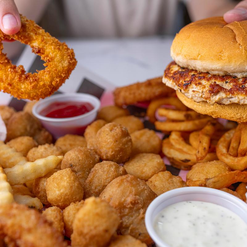$9.99 | $7.19 Shrimp only • Breaded shrimp with choice of fries, tots, or curly Qs